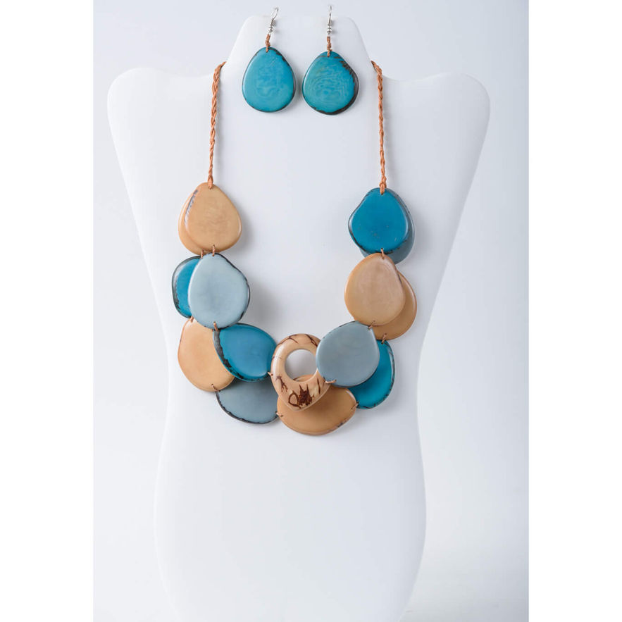 This layered tagua slice necklace features smooth, organic-shaped tagua pieces arranged in a bold cascading design. The layered silhouette creates depth, movement, and texture, giving the necklace a striking statement look while still feeling lightweight and easy to wear.